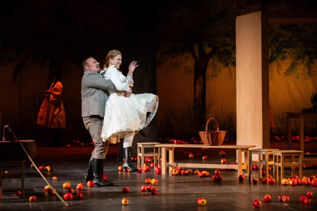 The beautiful Jenůfa waits, fearing that her beloved Števa has been taken off to join the army. She is expecting his child and his departure would jeopardise the forthcoming marriage. Števa’s stepbrother Laca also carries a fl ame for Jenůfa and asks her about Števa. The delighted Števa arrives with his friends and musicians at the mill – he had not been taken away and, together with the other recruits, celebrate their fortune with drink. Jenůfa’s strict guardian Kostelnička sees the riotous company with Števa in front of them all she announces that she would only give her consent for a marriage between Jenůfa and Števa after a probation year, during which Števa would not be allowed to drink. Laca convinces Jenůfa that Števa loves her only because of her beauty, and during the argument he cuts her face with a knife.