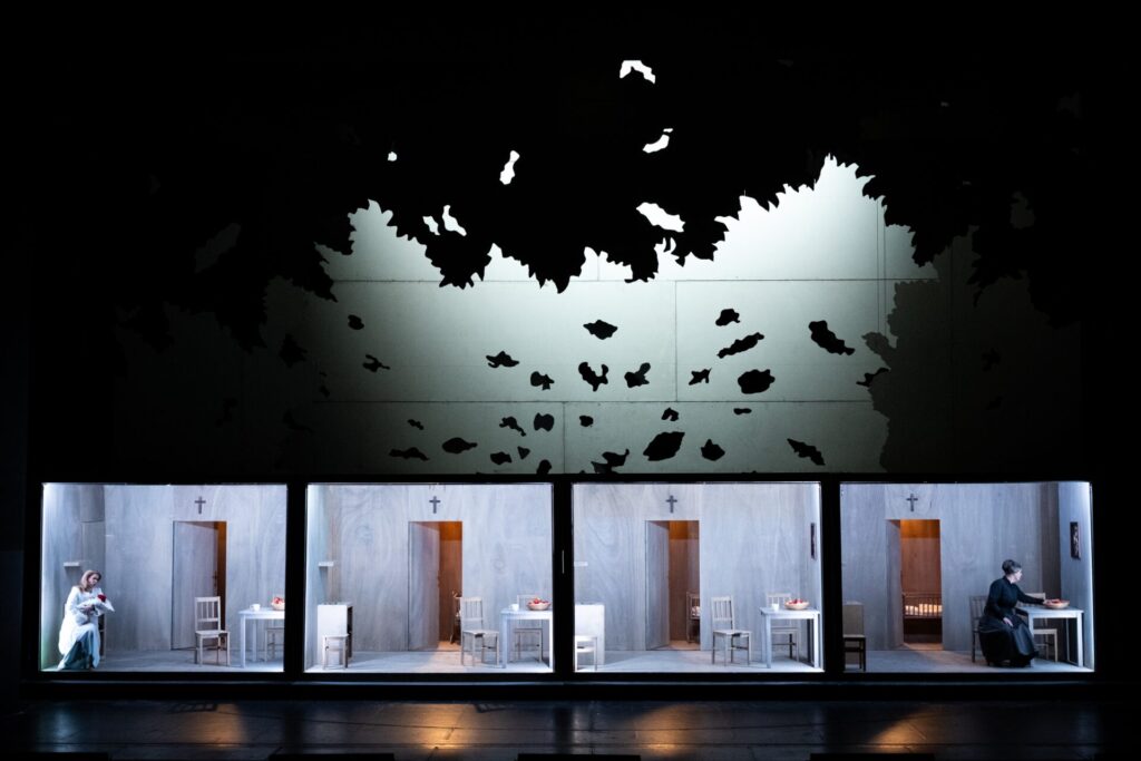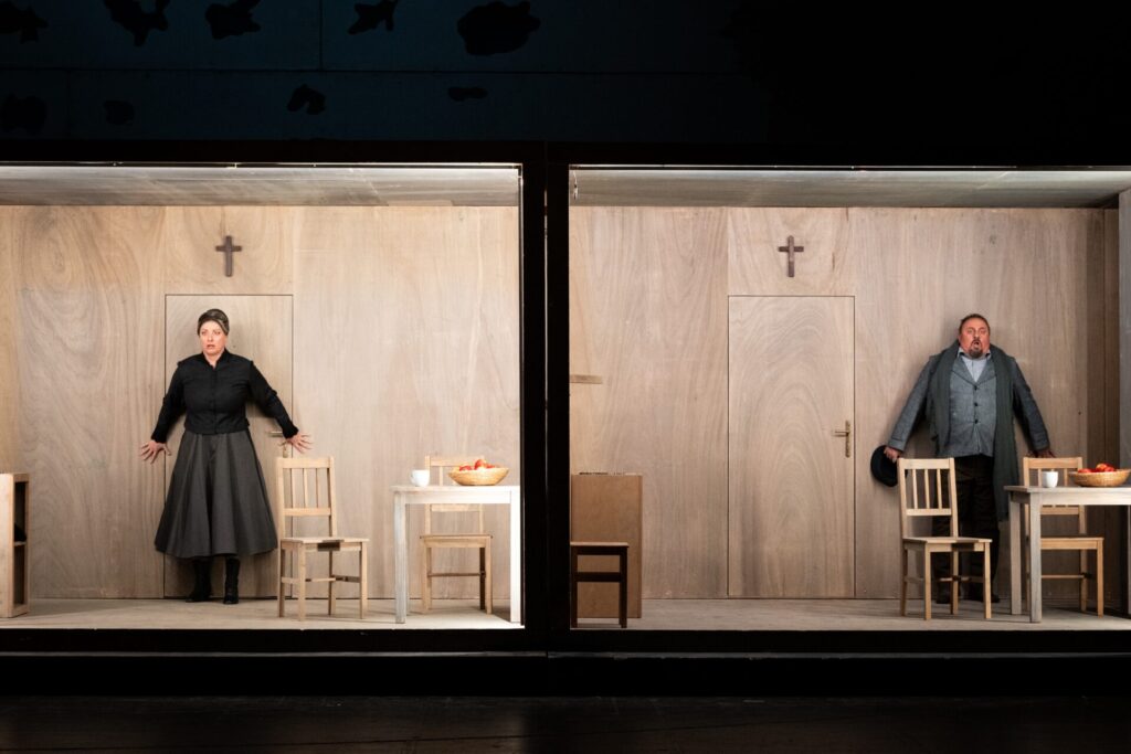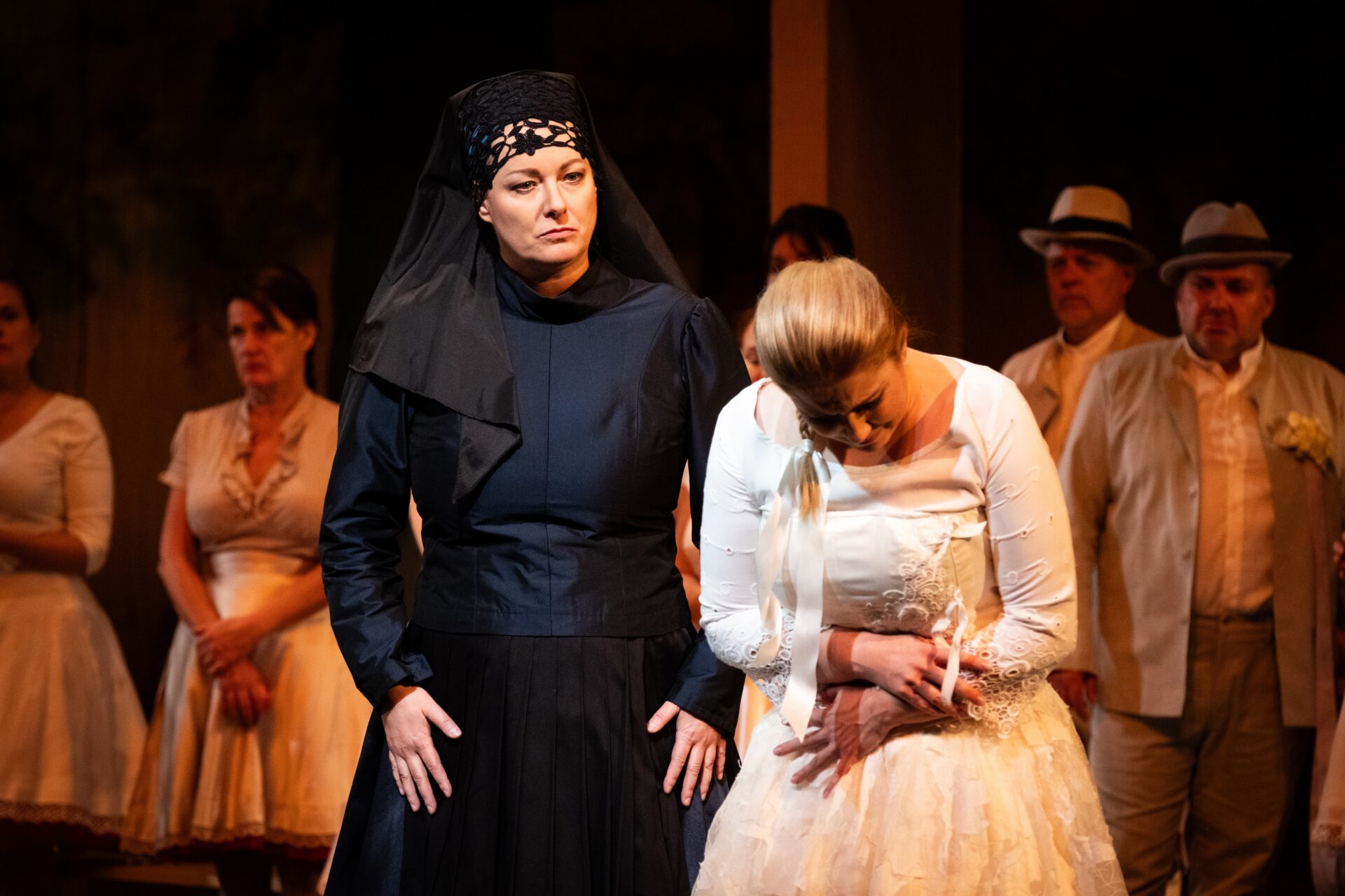 During the preparations for the wedding between Jenůfa and Laca the news breaks out that a dead child had been found in the river. Jenůfa recognises her little boy’s bonnet and the suspicion of murder falls upon her. Kostelnička admits her crime in front of the assembled guests. Before the Mayor leads her off to court, Jenůfa forgives her, for she understands that she did it out of love for her. Jenůfa does not believe that Laca would still want her and sends him away. Laca however wants to stay by her side and promises that he would be with her even in the bad times. Jenůfa realises that she has found her true love „and God is pleased with it“.
